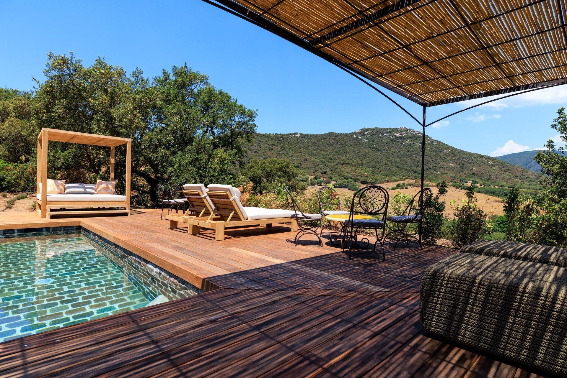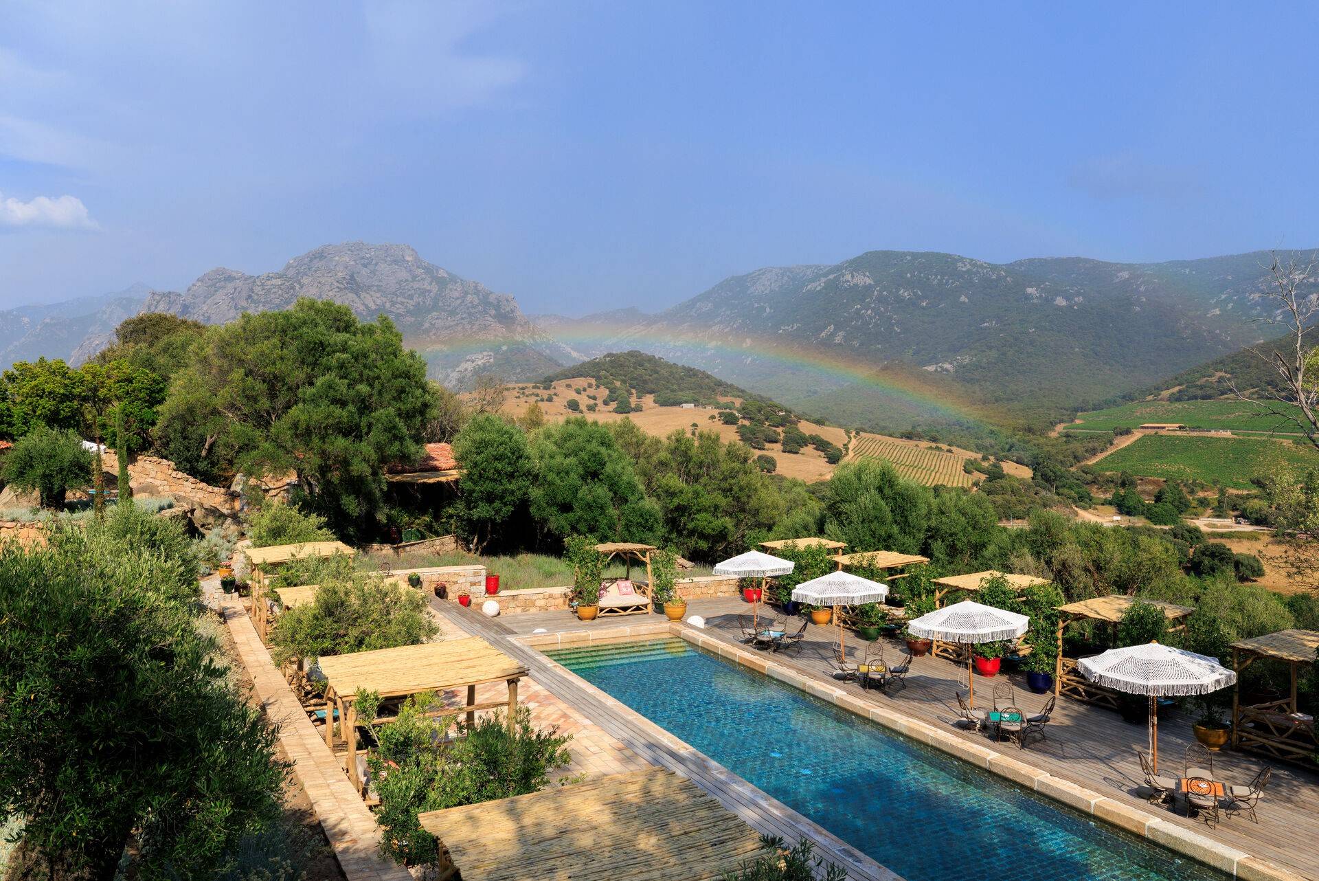 A Mandria di Murtoli se dresse au cœur de la vallée de l’Ortolo, à quelques pas du Domaine de Murtoli, comme un refuge moderne et authentique. Avec seulement cinq chambres et cinq suites, dont trois dotées d’une piscine privée, ce lieu exclusif propose un séjour de luxe et de sérénité, en harmonie avec l’âme corse.
